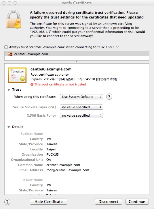 5.2 輸入FTP Server的IP address,系統會警告一個不被信任的憑證,當然此憑證是我剛剛產生的,所以要信任它囉: