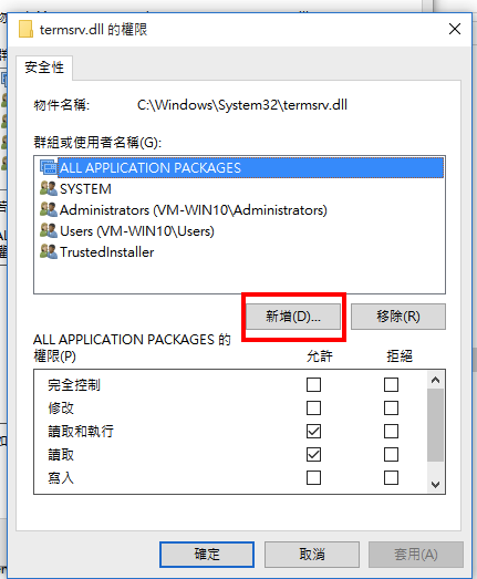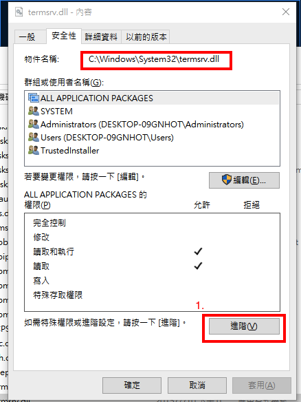 1.必須先修改 C:\Windows\System32\termsrv.dll檔案的權限,讓自己可以對這支檔案有修改的權限。
