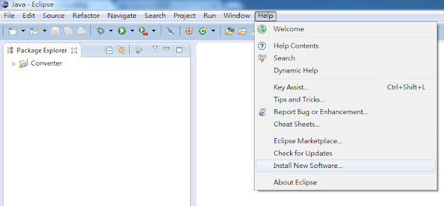 請選擇在工具列上的「Help」--「Install New Software」。會開啟一個視窗。