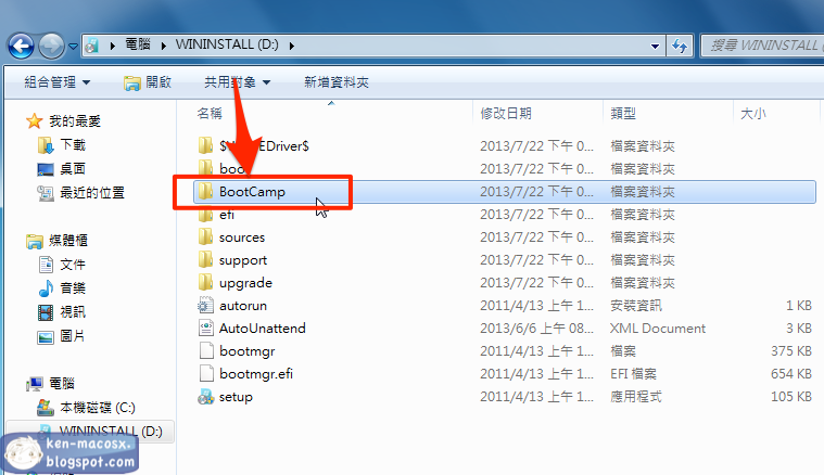 2. 磁碟裡面有一個叫做「BootCamp」的資料夾,其他檔案不用管他,那是 Windows 安裝程式,點「BootCamp」資料夾就可以了。