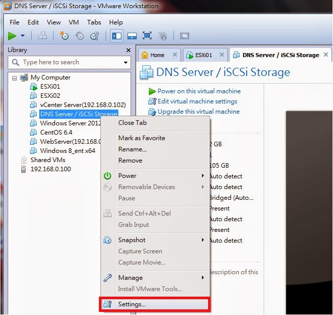 Step1:將VM關機,然後在要新增硬碟空間的VM,按右鍵選Setting,來查看硬碟配置空間資訊。