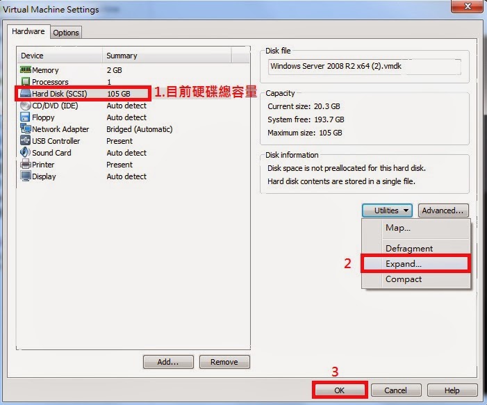 Step1-1:目前硬碟容量為105GB,點開Utilities後選Expand,按OK。 Step2:設定硬碟空間的總容量。要新增硬碟空間容量60GB,所以Max. disk size=105+60=165GB,按Expand。