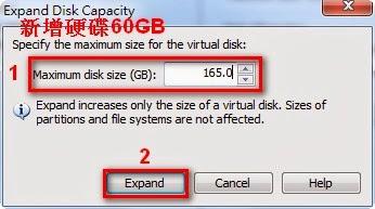 Step2:設定硬碟空間的總容量。要新增硬碟空間容量60GB,所以Max. disk size=105+60=165GB,按Expand。