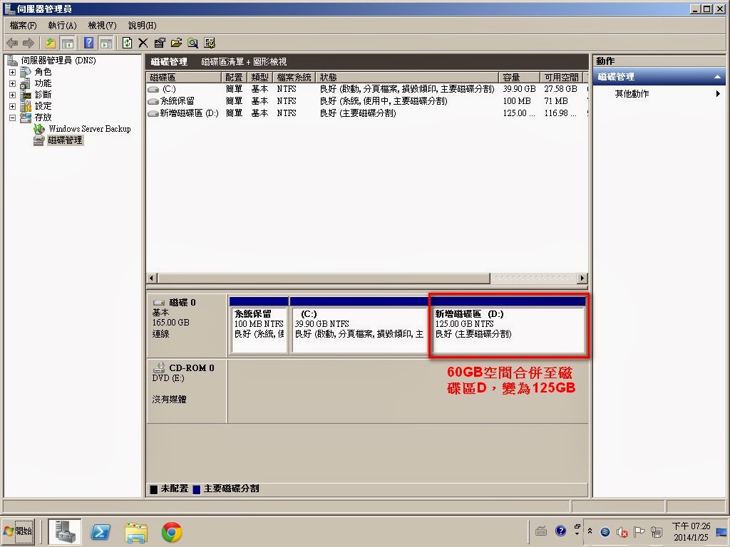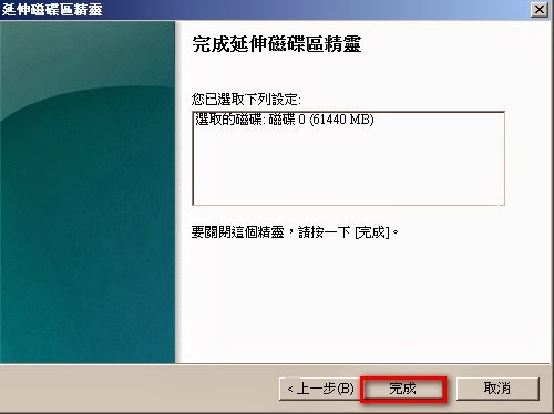 Step5-4:延伸磁碟區容量完成。 Step6:未配置60GB的磁碟容量已經合併到磁碟區D。