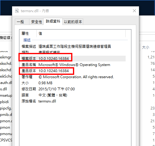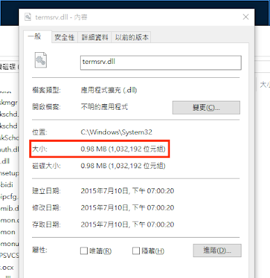 本篇修改的 termsrv.dll版本是 10.10240.16384,檔案大小: 1032192位元。