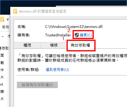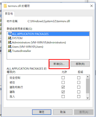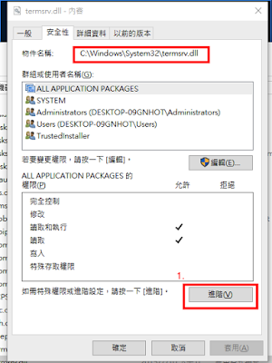 1.必須先修改 C:\Windows\System32\termsrv.dll檔案的權限,讓自己可以對這支檔案有修改的權限。